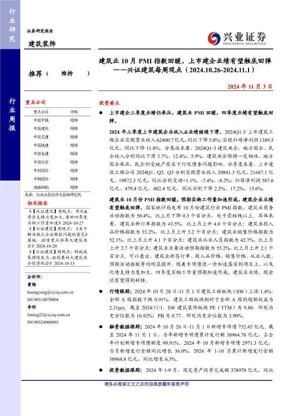 【兴业证券】【20241103】建筑业10月PMI指数回暖,上市建企业绩有望触底回弹-15页