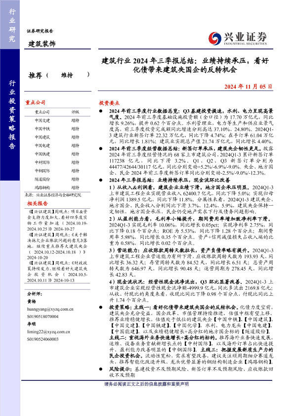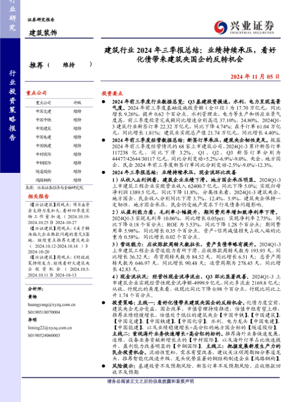 三季报总结 业绩分析 化债机会 央企国企 建筑行业