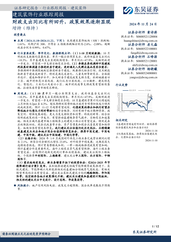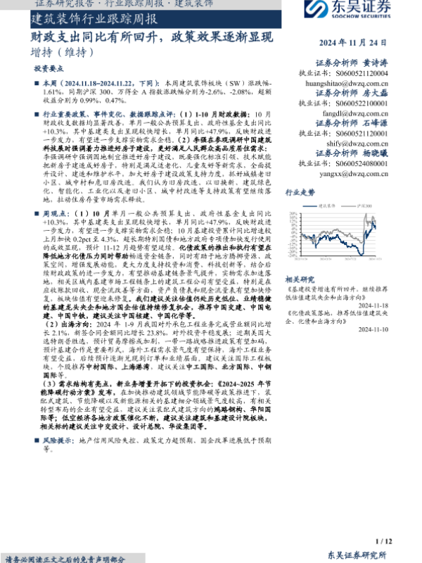 【东吴证券】【20241124】建筑装饰行业跟踪周报:财政支出同比有所回升,政策效果逐渐显现-12页
