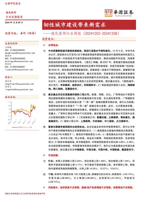 【华源证券】【20241209】建筑装饰行业周报:韧性城市建设带来新需求-12页