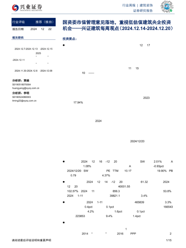 【兴业证券】【20241222】兴证建筑每周观点:国资委市值管理意见落地,重视低估值建筑央企投资机会-15页