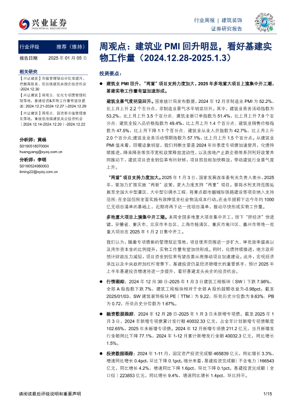 【兴业证券】【20250105】建筑装饰行业周观点:建筑业PMI回升明显,看好基建实物工作量-15页