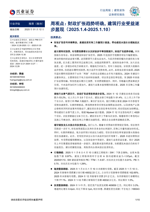 【兴业证券】【20250112】建筑装饰行业周观点:财政扩张趋势明确,建筑行业受益逐步显现-15页
