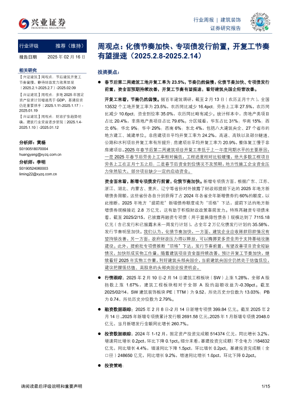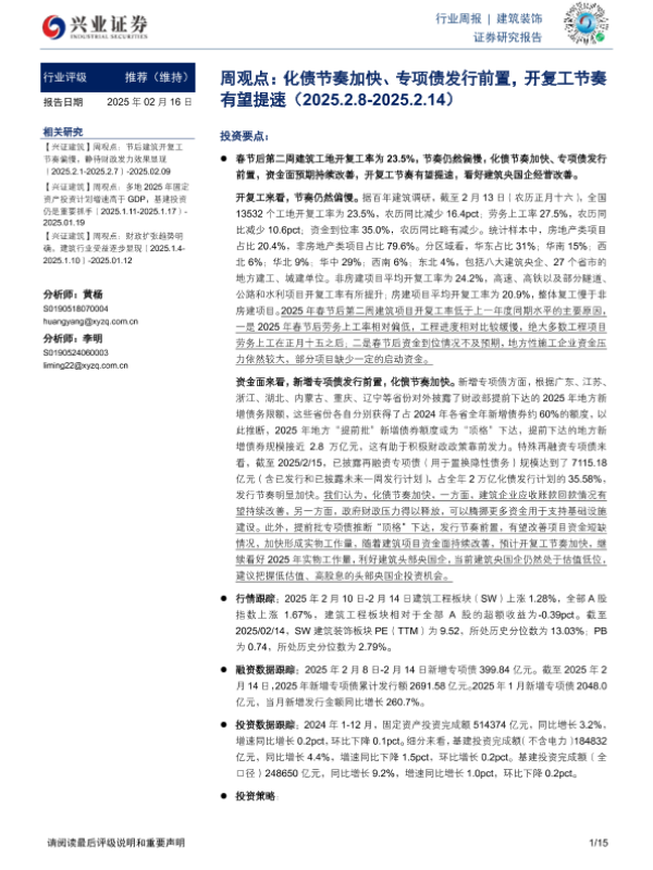 【兴业证券】【20250216】建筑装饰周观点:化债节奏加快、专项债发行前置,开复工节奏有望提速-15页