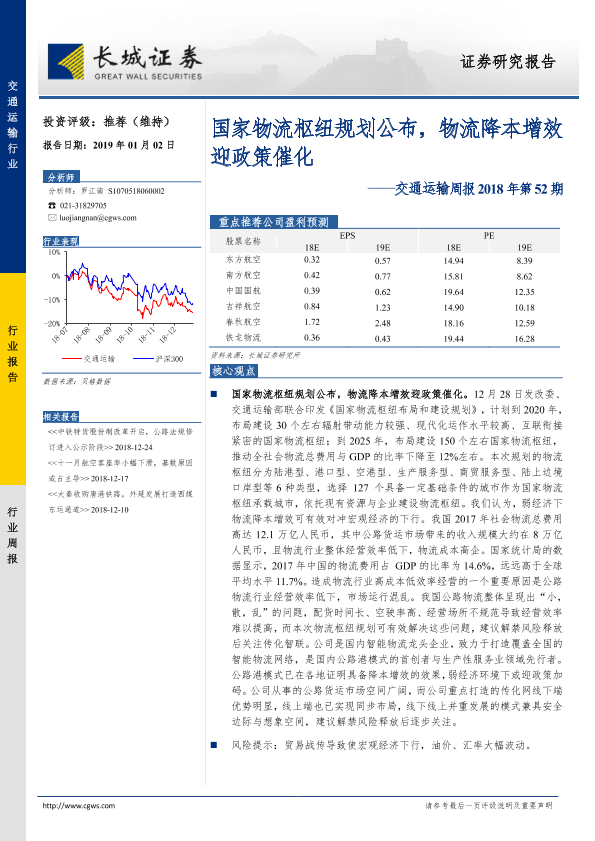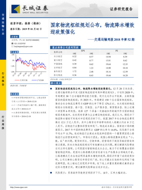 【长城证券】【20190102】国家物流枢纽规划公布,物流降本增效迎政策催化-15页