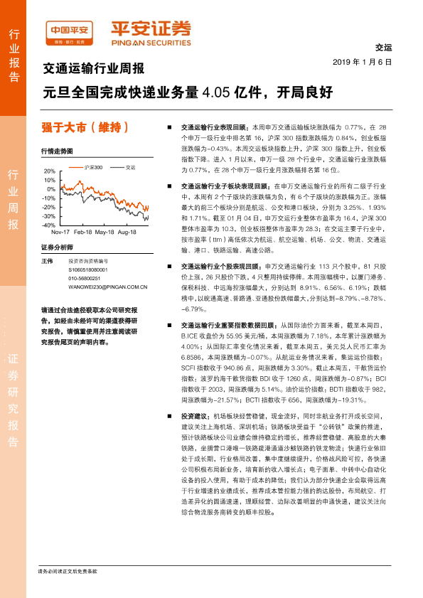 交通运输 元旦假期 快递业务 投资建议 行业表现