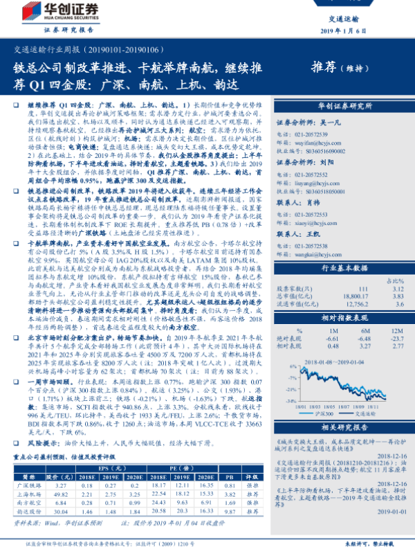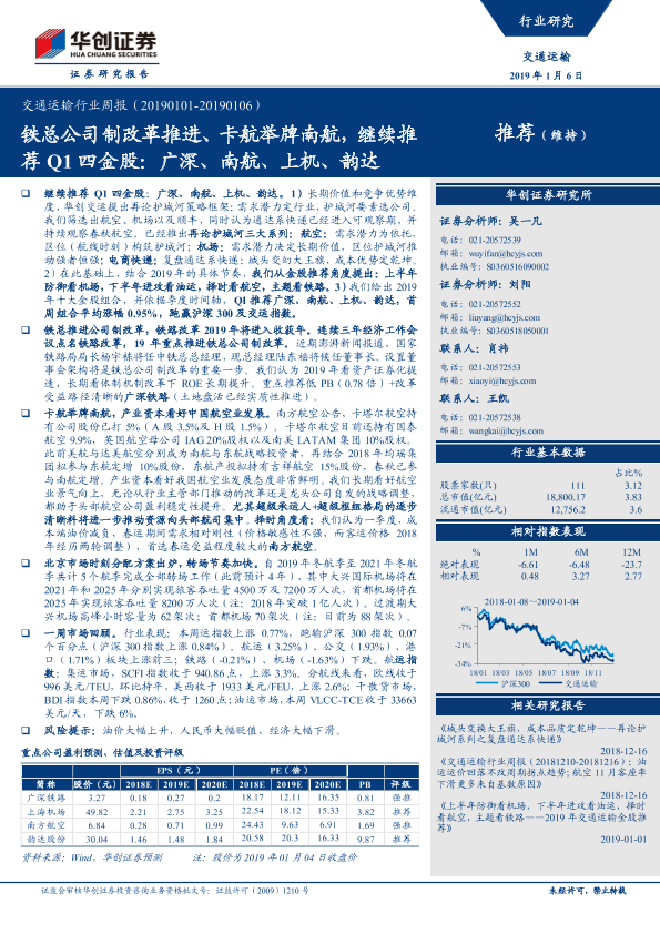 【华创证券】【20190106】交通运输行业周报:铁总公司制改革推进、卡航举牌南航,继续推荐Q1四金股:广深、南航、上机、韵达-12页