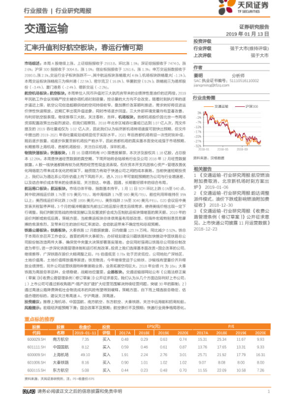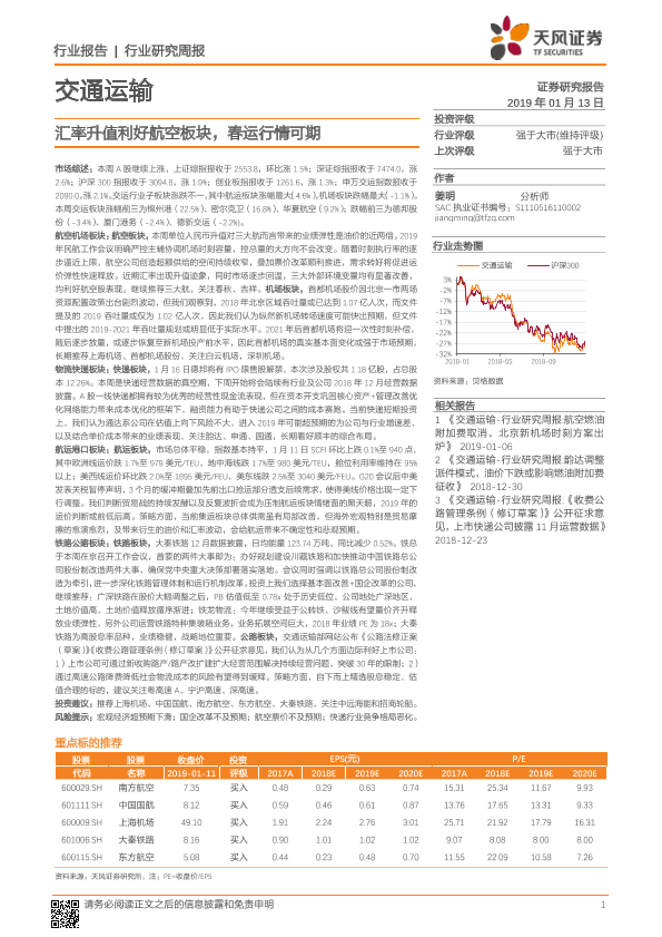 【天风证券】【20190113】交通运输行业研究周报:汇率升值利好航空板块,春运行情可期-14页