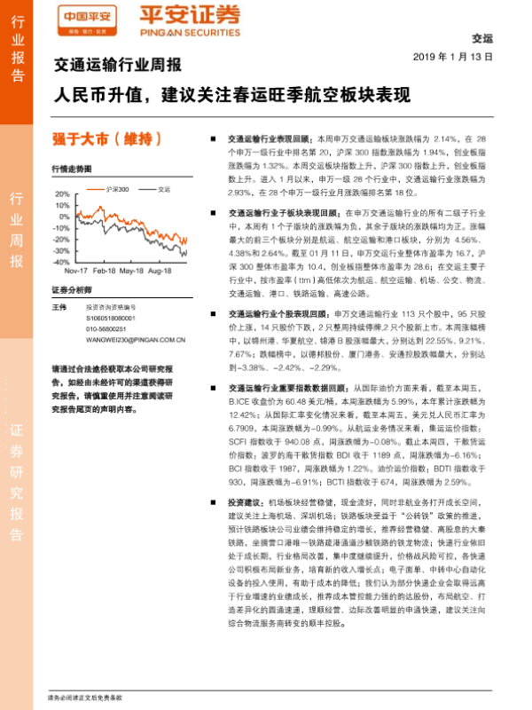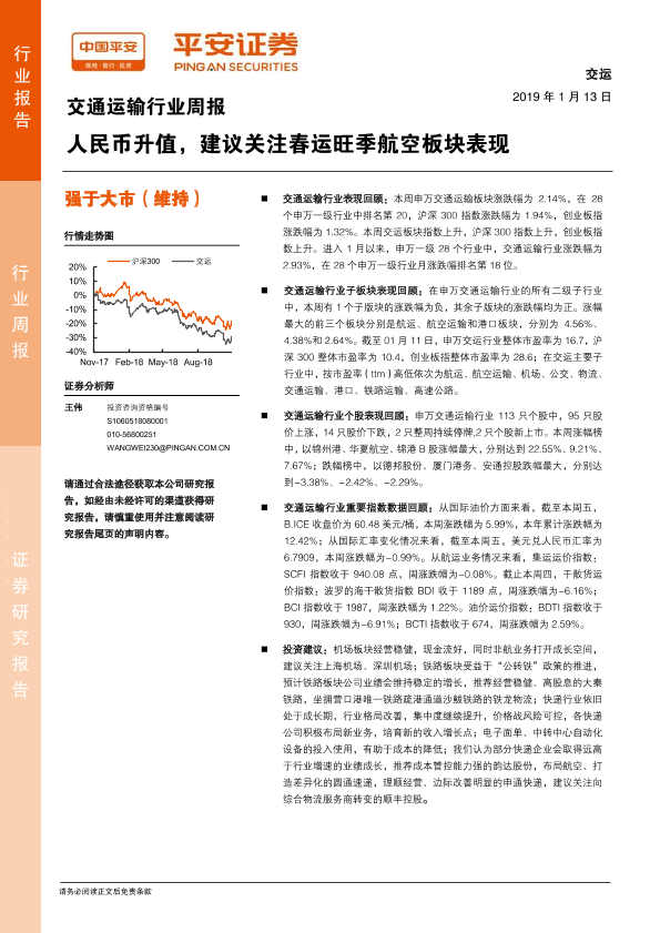 【平安证券】【20190113】交通运输行业周报:人民币升值,建议关注春运旺季航空板块表现-13页