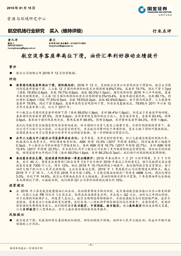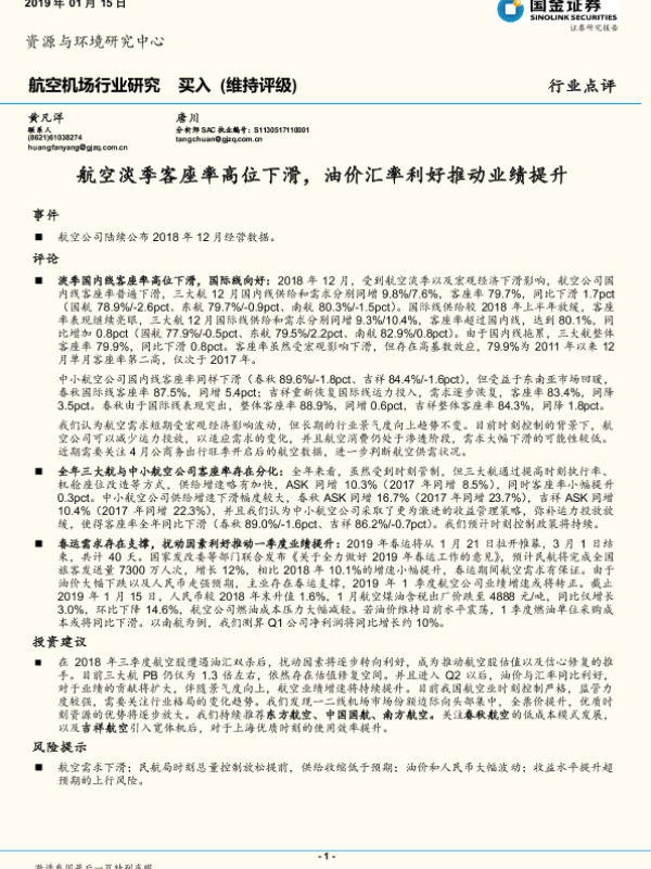 【国金证券】【20190115】航空淡季客座率高位下滑,油价汇率利好推动业绩提升-5页