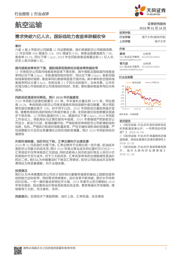 【天风证券】【20190116】航空运输行业点评:需求突破六亿人次,国际线助力客座率跌幅收窄-6页