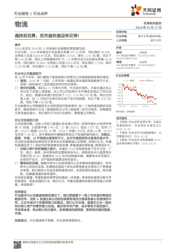 【天风证券】【20190117】物流行业点评:遇挫则后勇,低市值快递迎来反弹-6页