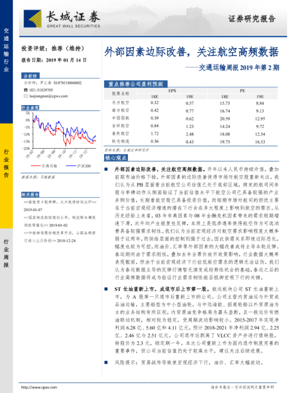 【长城证券】【20190114】外部因素边际改善,关注航空高频数据-18页