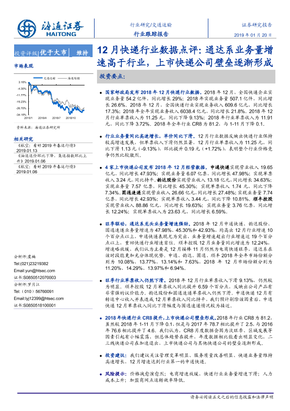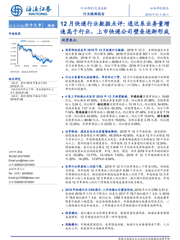 【海通证券】【20190120】12月快递行业数据点评:通达系业务量增速高于行业,上市快递公司壁垒逐渐形成-4页