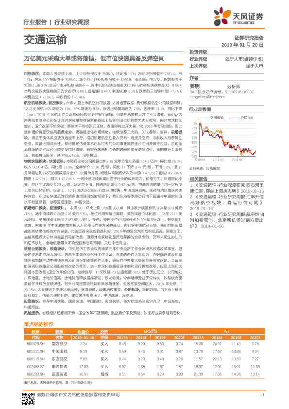 【天风证券】【20190120】交通运输行业研究周报:万亿美元采购大单或将落锤,低市值快递具备反弹空间-18页