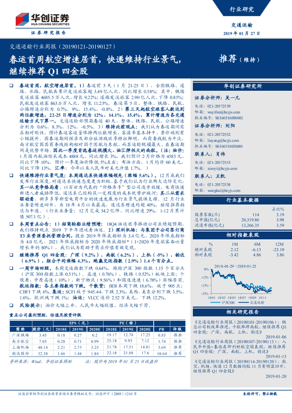 【华创证券】【20190127】交通运输行业周报:春运首周航空增速居首,快递维持行业景气,继续推荐Q1四金股-11页