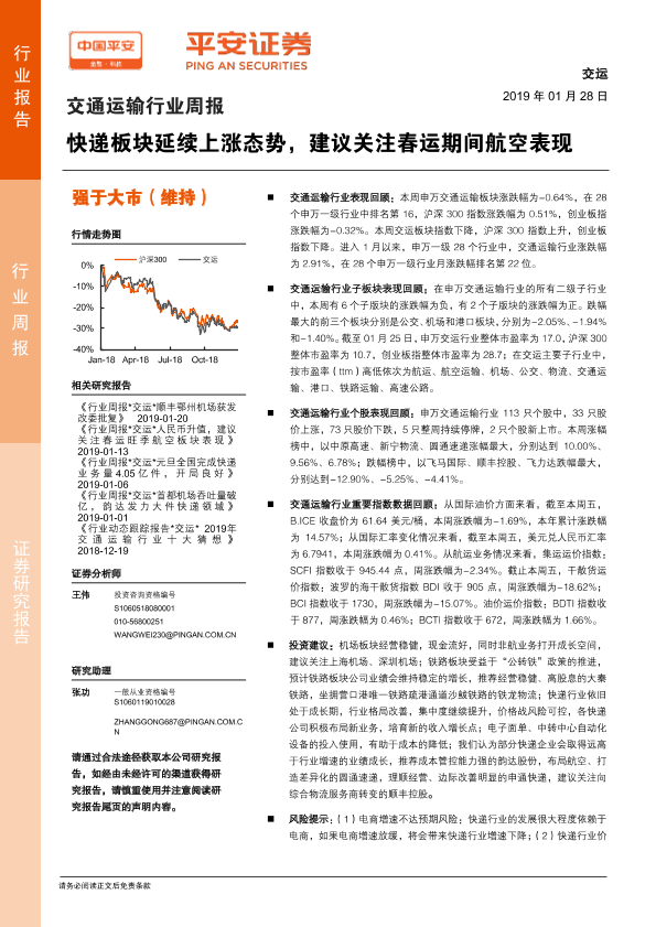 【平安证券】【20190128】交通运输行业周报:快递板块延续上涨态势,建议关注春运期间航空表现-15页