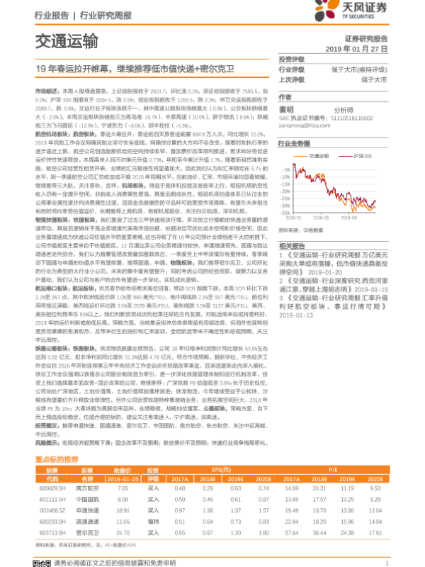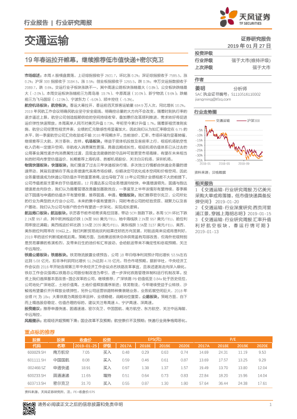 【天风证券】【20190127】交通运输行业研究周报:19年春运拉开帷幕,继续推荐低市值快递+密尔克卫-15页