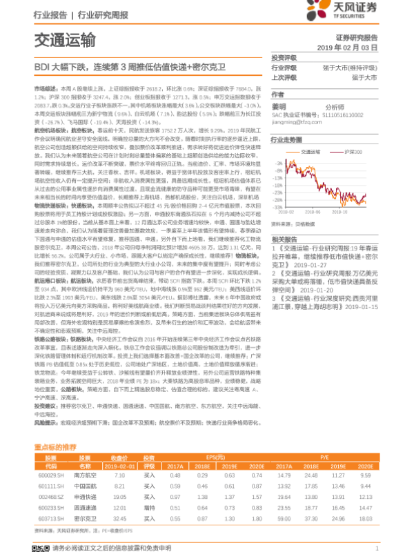 【天风证券】【20190203】交通运输行业研究周报:BDI大幅下跌,连续第3周推低估值快递+密尔克卫-12页