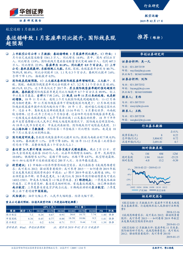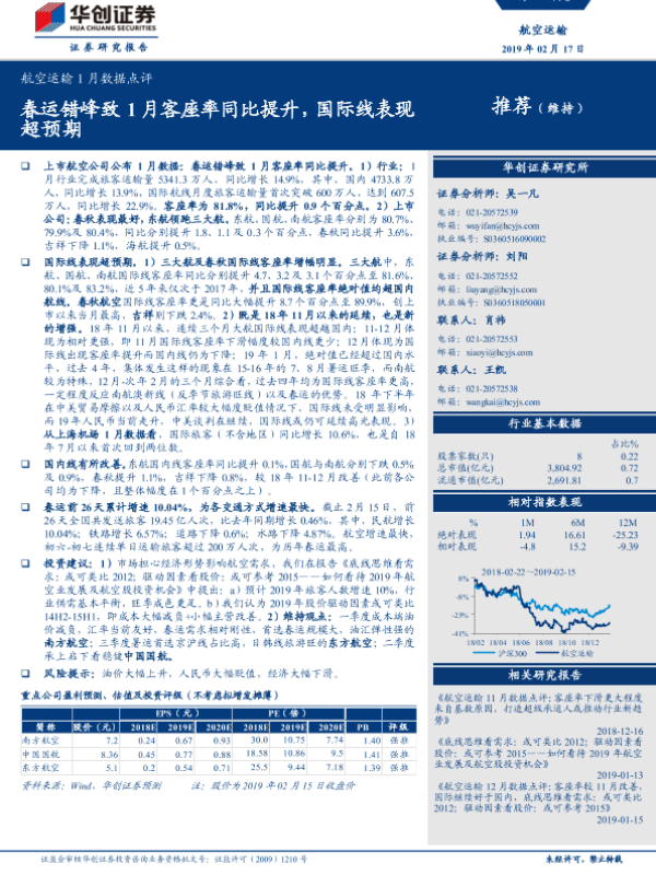 【华创证券】【20190217】航空运输1月数据点评:春运错峰致1月客座率同比提升,国际线表现超预期-8页