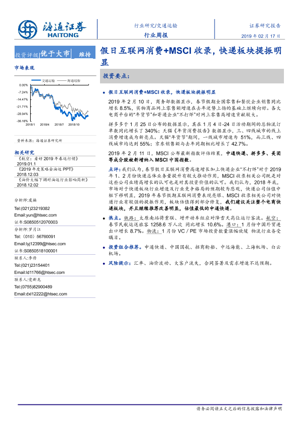 【海通证券】【20190217】交通运输行业周报:假日互联网消费+MSCI收录,快递板块提振明显-12页