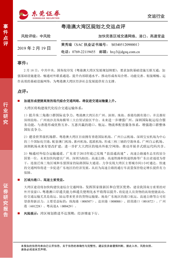 【东莞证券】【20190219】粤港澳大湾区规划之交运点评:加快完善区域交通网络,港口、高速受益-2页