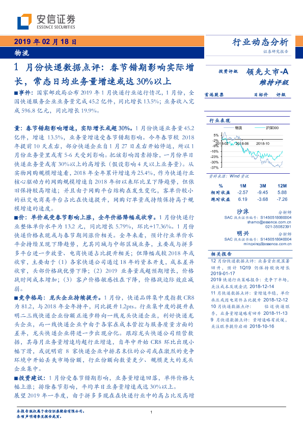 【安信证券】【20190218】1月份快递数据点评:春节错期影响实际增长,常态日均业务量增速或达30%以上-9页
