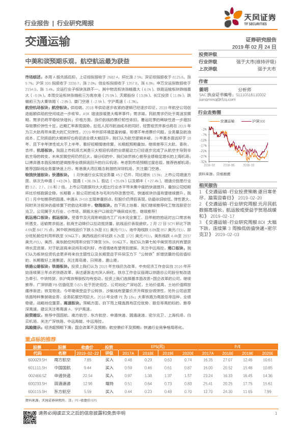 【天风证券】【20190224】交通运输行业研究周报:中美和谈预期乐观,航空航运最为获益-10页