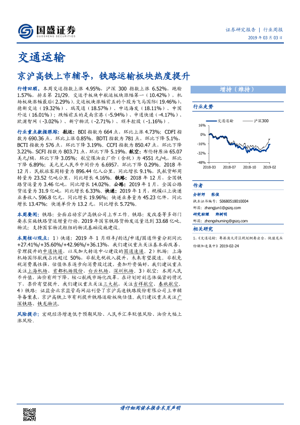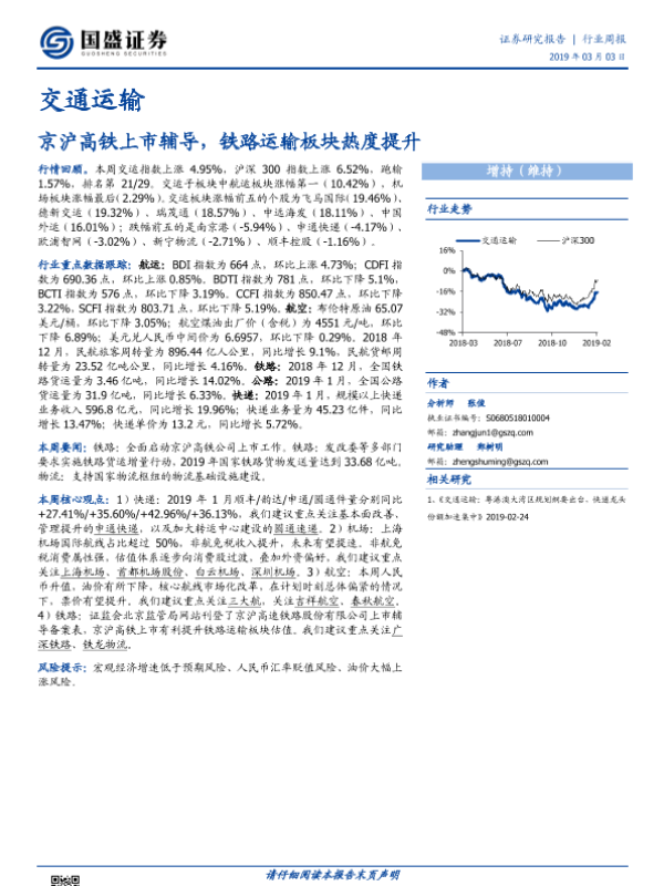 【国盛证券】【20190303】交通运输行业周报:京沪高铁上市辅导,铁路运输板块热度提升-17页