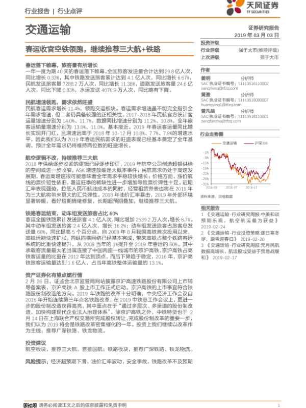 【天风证券】【20190303】交通运输行业点评:春运收官空铁领跑,继续推荐三大航+铁路-7页