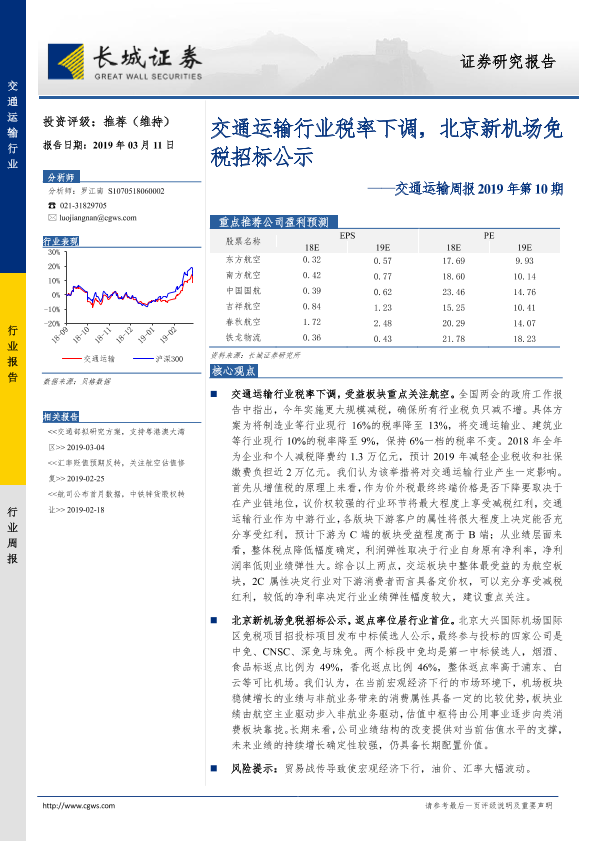 【长城证券】【20190311】交通运输周报2019年第10期:交通运输行业税率下调,北京新机场免税招标公示-17页