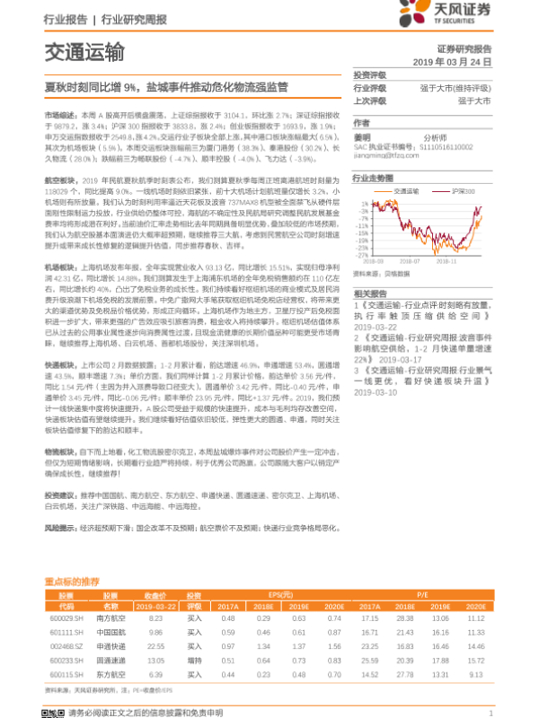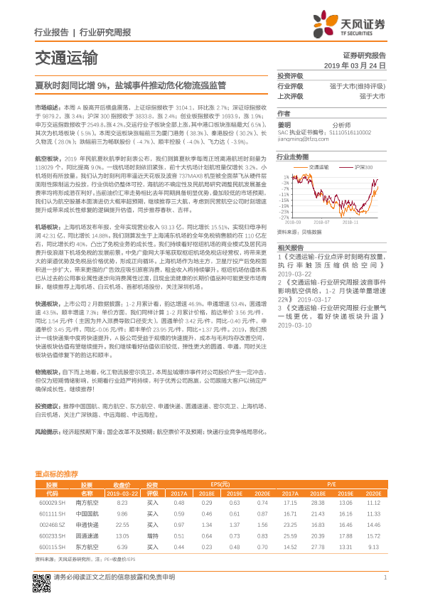 【天风证券】【20190324】交通运输行业研究周报:夏秋时刻同比增9%,盐城事件推动危化物流强监管-13页