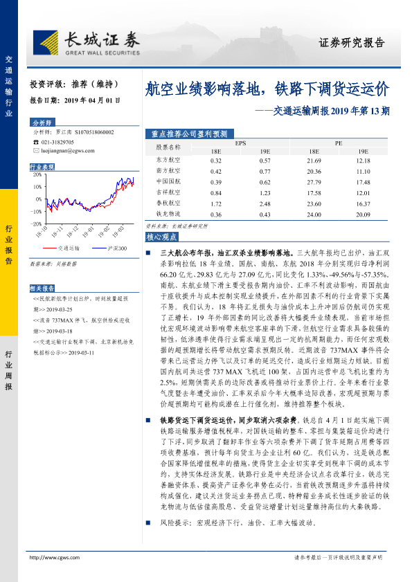 【长城证券】【20190401】航空业绩影响落地,铁路下调货运运价-17页