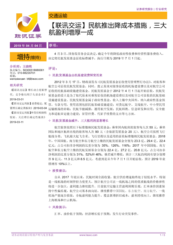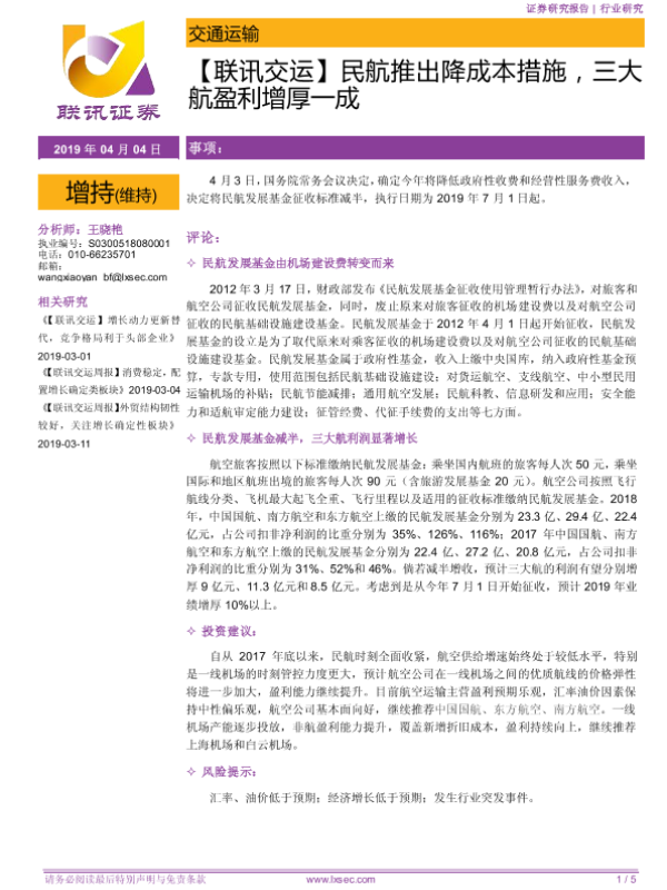 【粤开证券】【20190404】民航推出降成本措施,三大航盈利增厚一成-5页