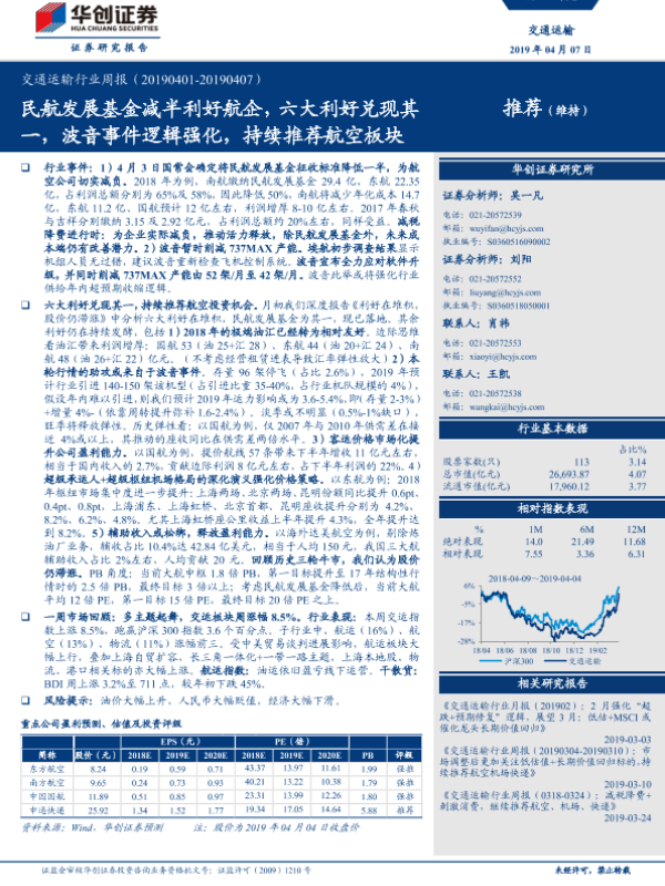 【华创证券】【20190407】交通运输行业周报:民航发展基金减半利好航企,六大利好兑现其一,波音事件逻辑强化,持续推荐航空板块-16页
