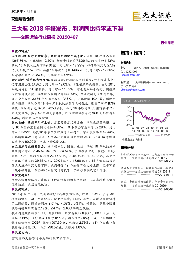 【光大证券】【20190407】三大航2018年报发布,利润同比持平或下滑-6页