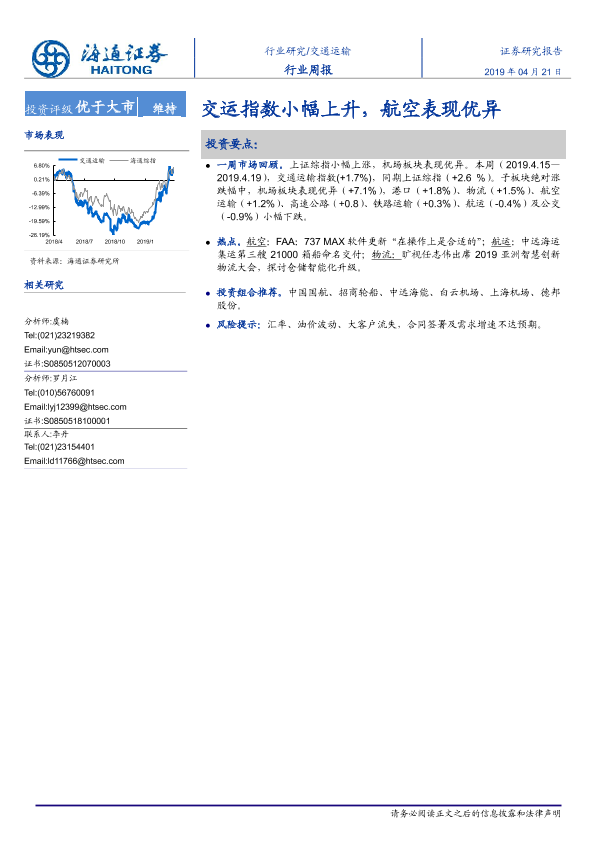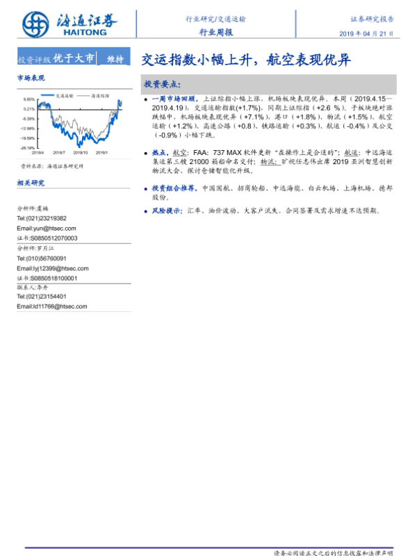 【海通证券】【20190421】交通运输行业周报:交运指数小幅上升,航空表现优异-10页