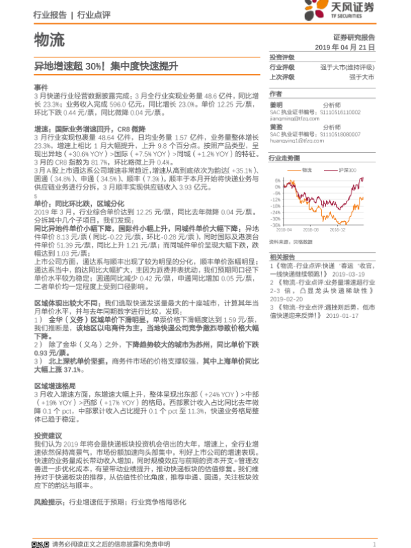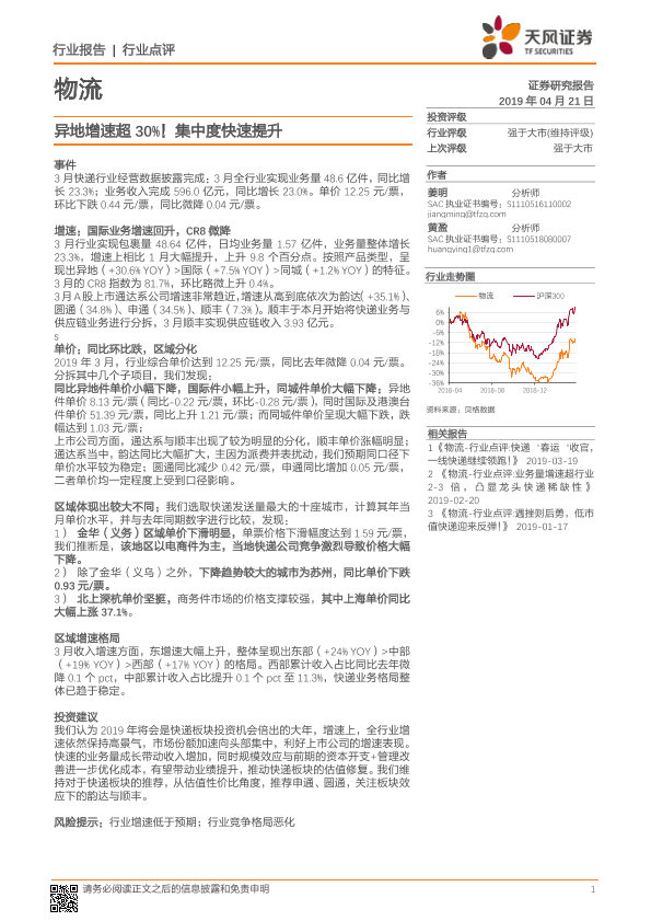 【天风证券】【20190421】物流行业点评:异地增速超30%!集中度快速提升-7页