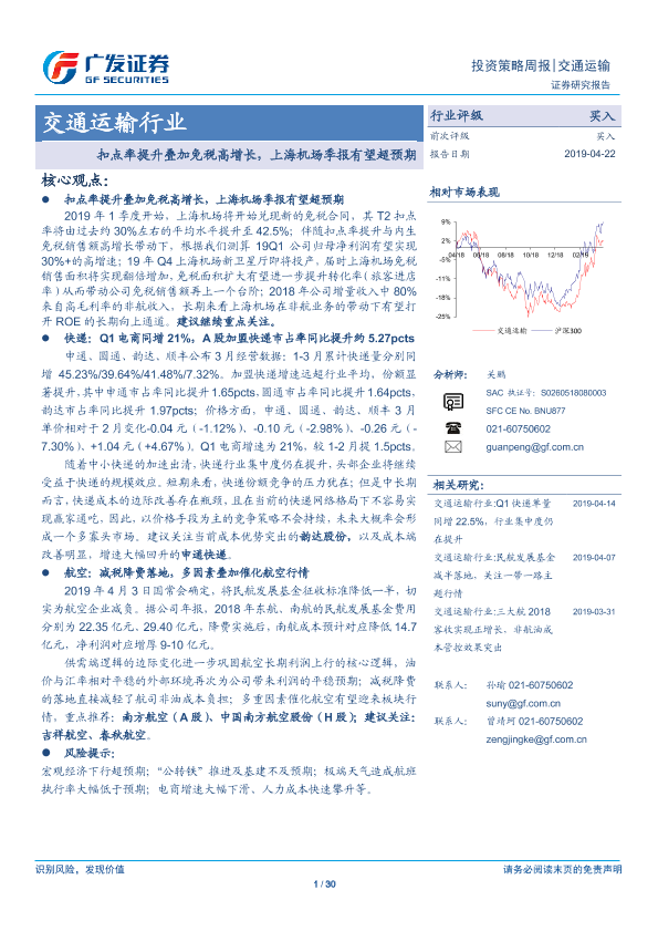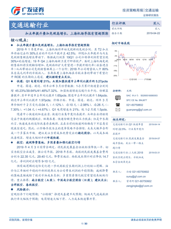 【广发证券】【20190422】交通运输行业投资策略周报:扣点率提升叠加免税高增长,上海机场季报有望超预期-30页