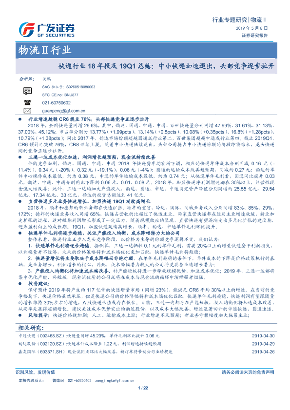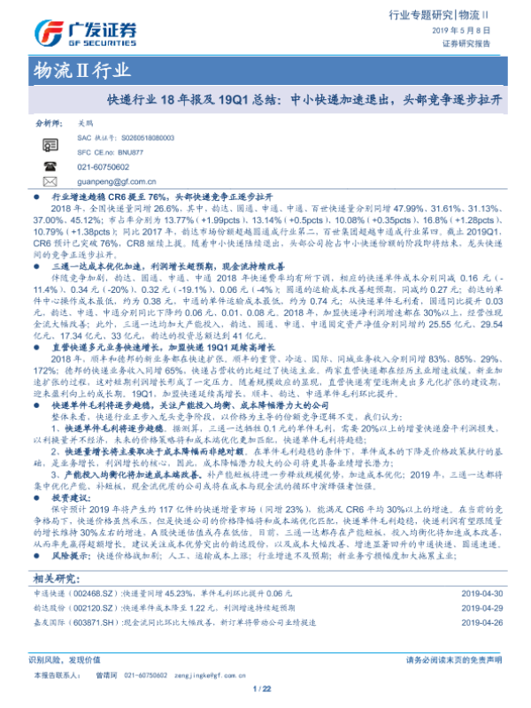 【广发证券】【20190508】快递行业18年报及19Q1总结:中小快递加速退出,头部竞争逐步拉开-22页