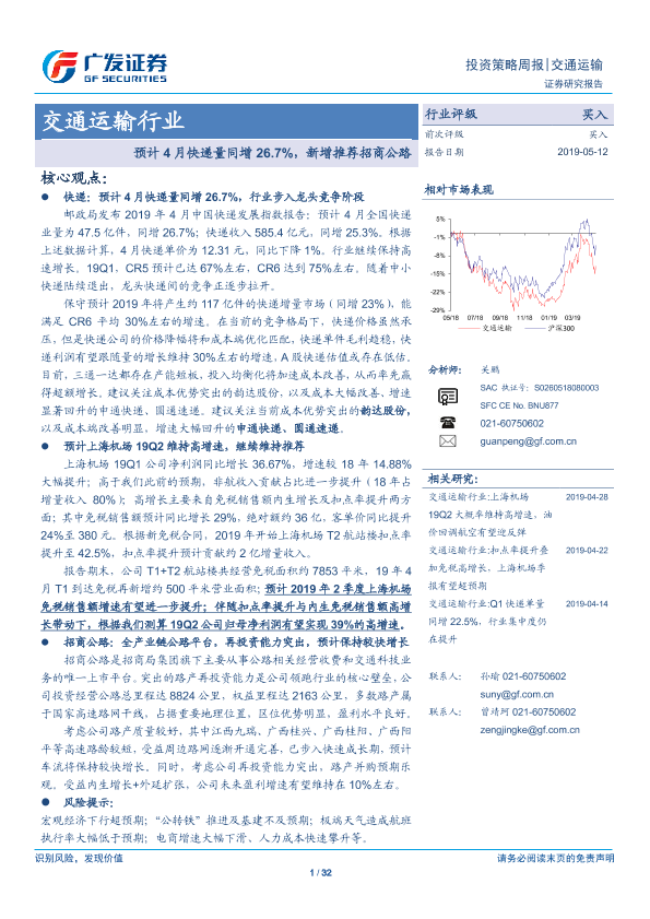 【广发证券】【20190512】交通运输行业投资策略周报:预计4月快递量同增26.7%,新增推荐招商公路-32页