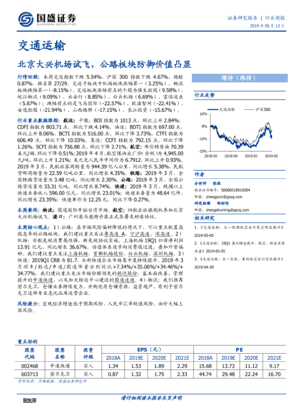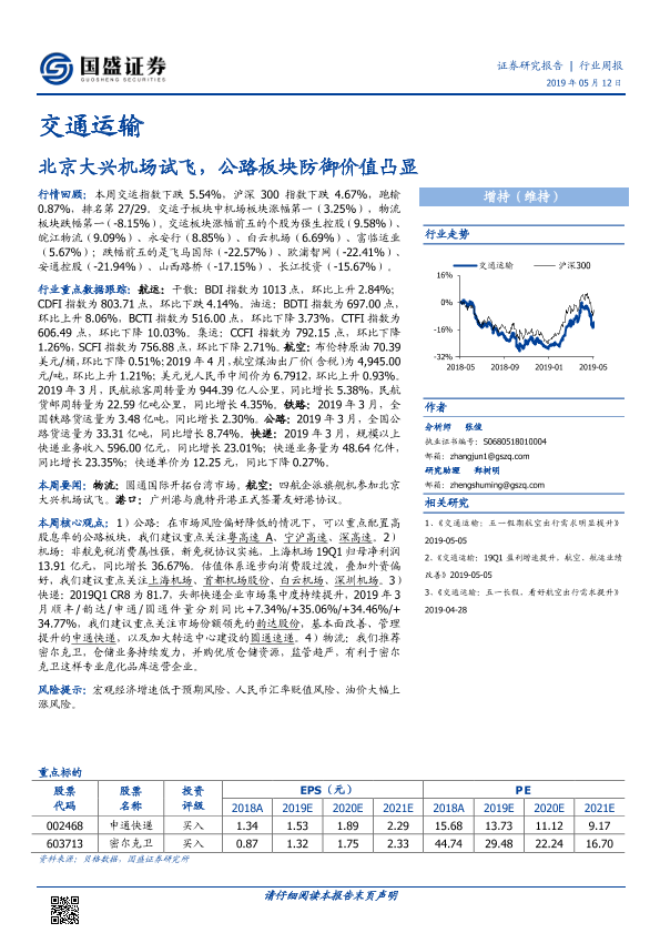 【国盛证券】【20190512】交通运输行业周报:北京大兴机场试飞,公路板块防御价值凸显-17页