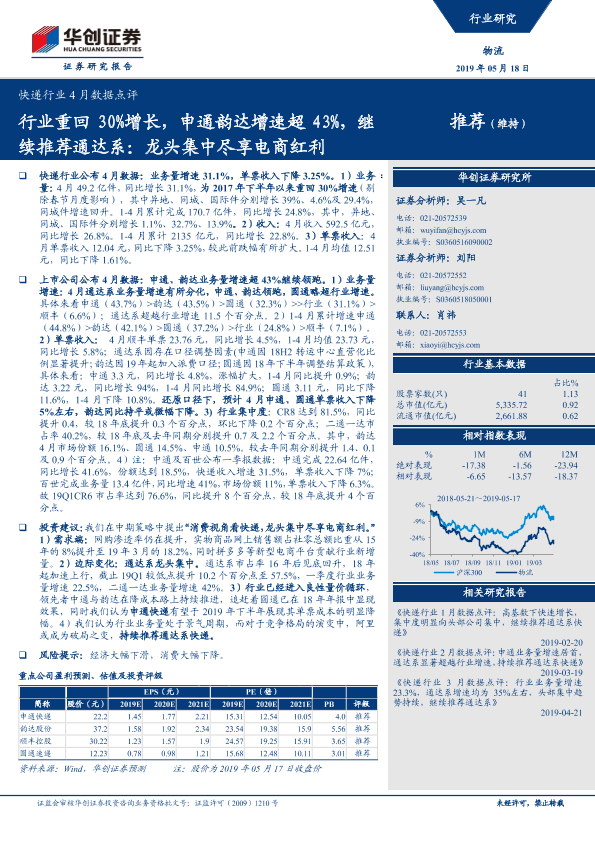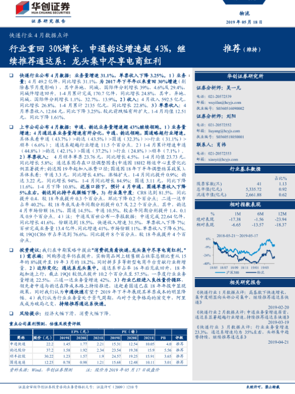 【华创证券】【20190518】快递行业4月数据点评:行业重回30%增长,申通韵达增速超43%,继续推荐通达系:龙头集中尽享电商红利-7页