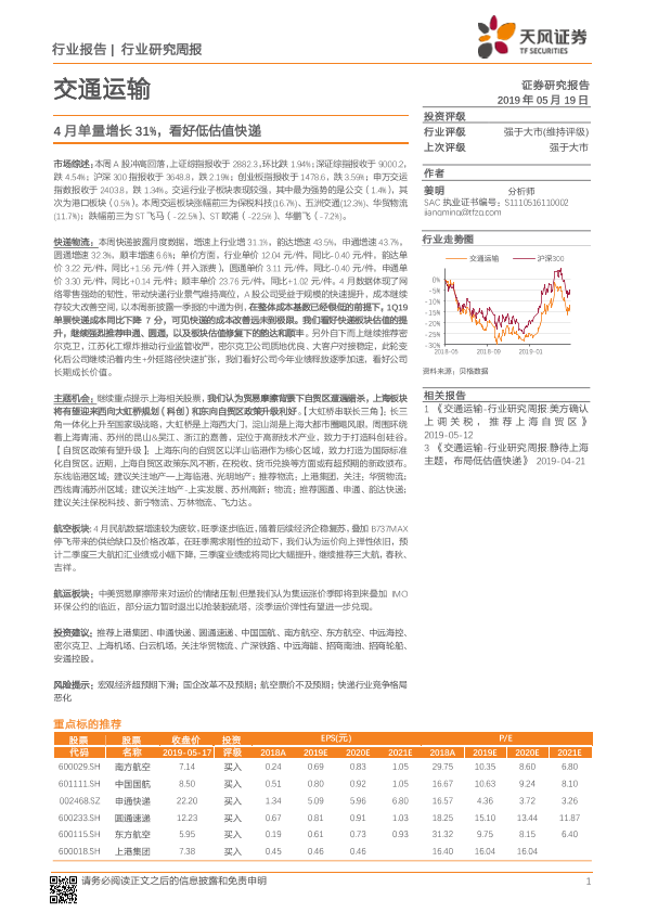 【天风证券】【20190519】4月单量增长31%,看好低估值快递-12页