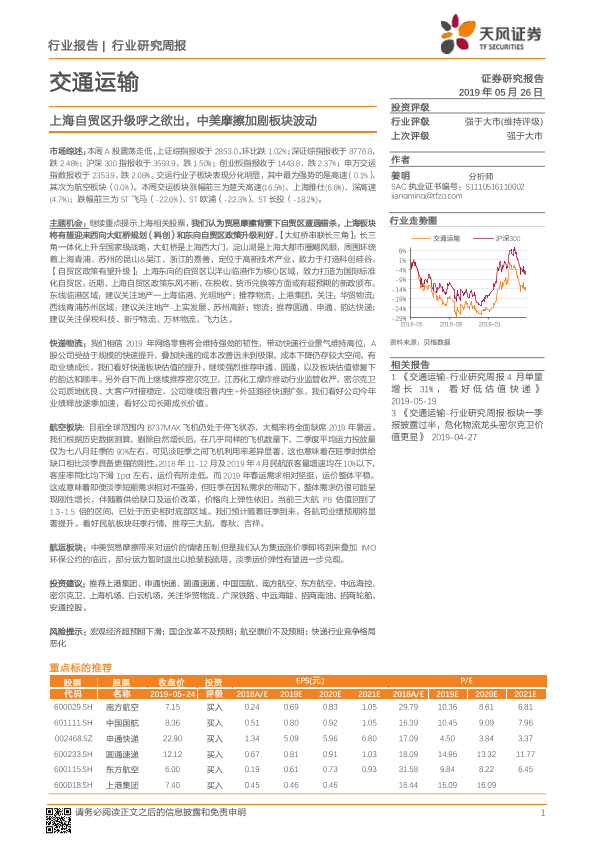 【天风证券】【20190526】交通运输行业研究周报:上海自贸区升级呼之欲出,中美摩擦加剧板块波动-11页