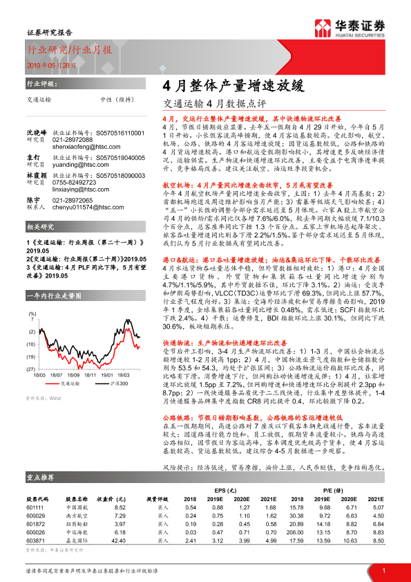 【华泰证券】【20190528】交通运输4月数据点评:4月整体产量增速放缓-25页