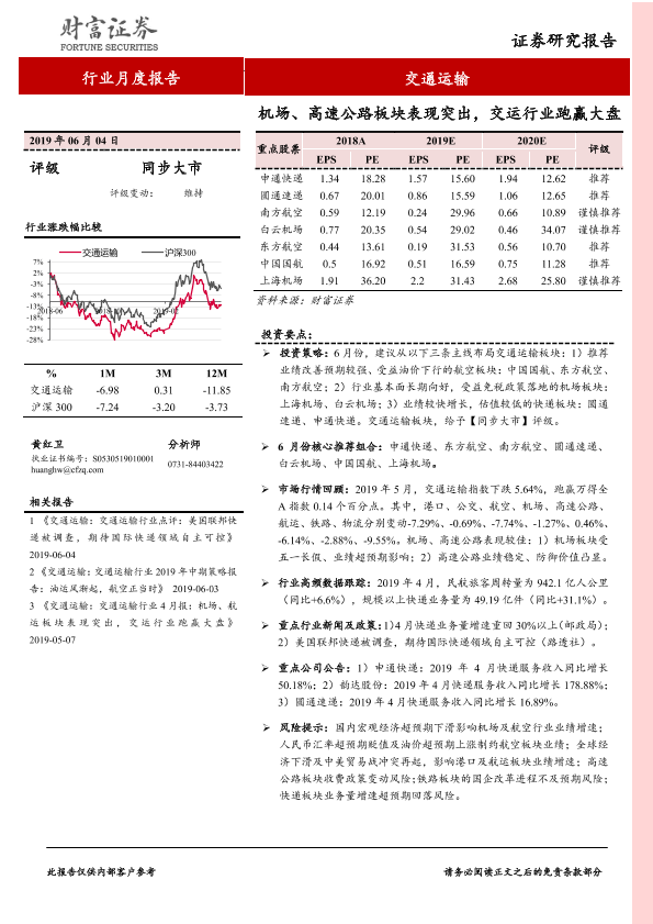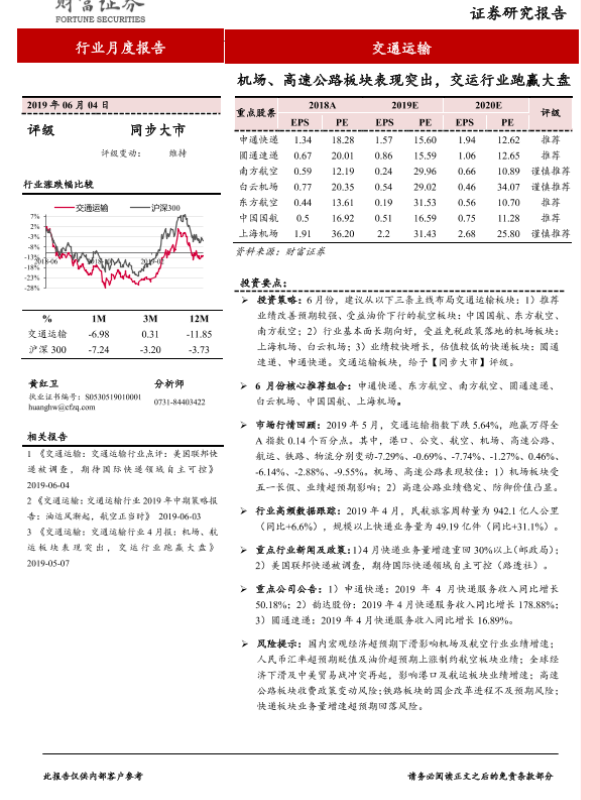 【财信证券】【20190604】交通运输行业月度报告:机场、高速公路板块表现突出,交运行业跑赢大盘-20页