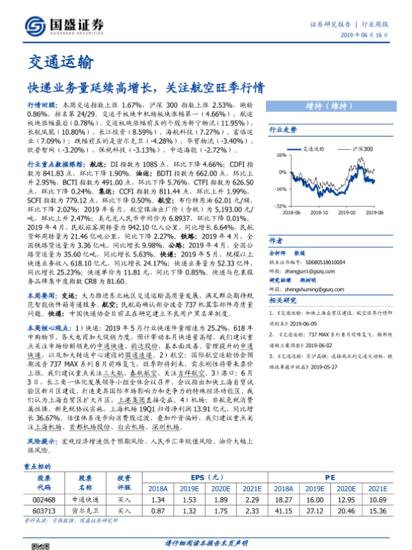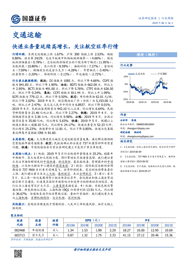 【国盛证券】【20190616】交通运输行业周报:快递业务量延续高增长,关注航空旺季行情-17页