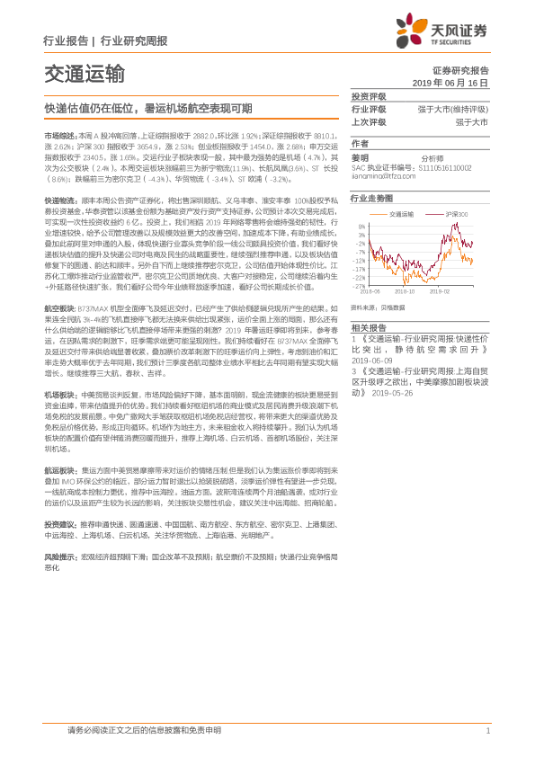 【天风证券】【20190616】交通运输行业研究周报:快递估值仍在低位,暑运机场航空表现可期-13页