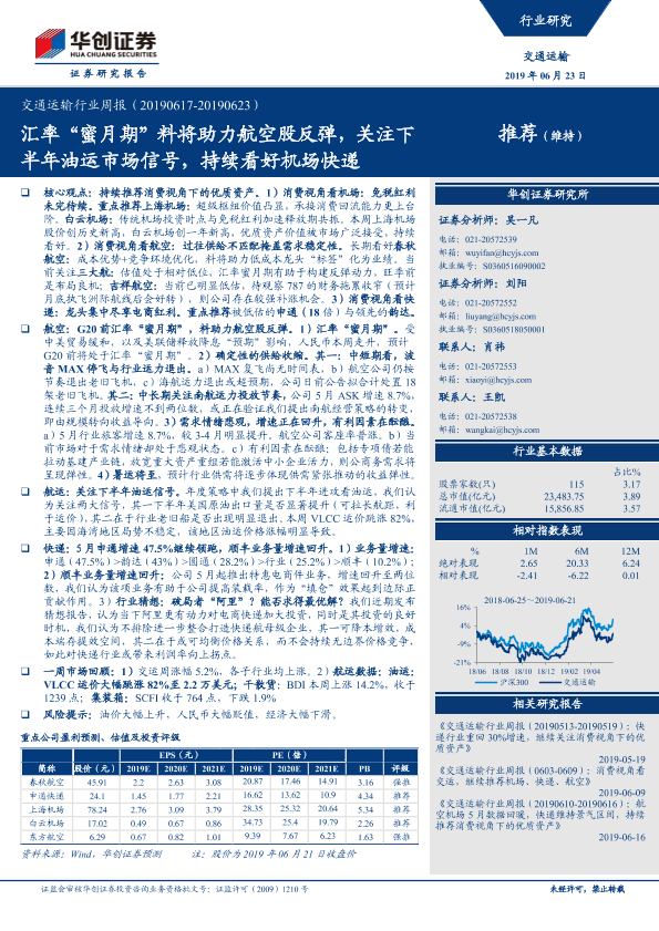 【华创证券】【20190623】交通运输行业周报:汇率“蜜月期”料将助力航空股反弹,关注下半年油运市场信号,持续看好机场快递-12页